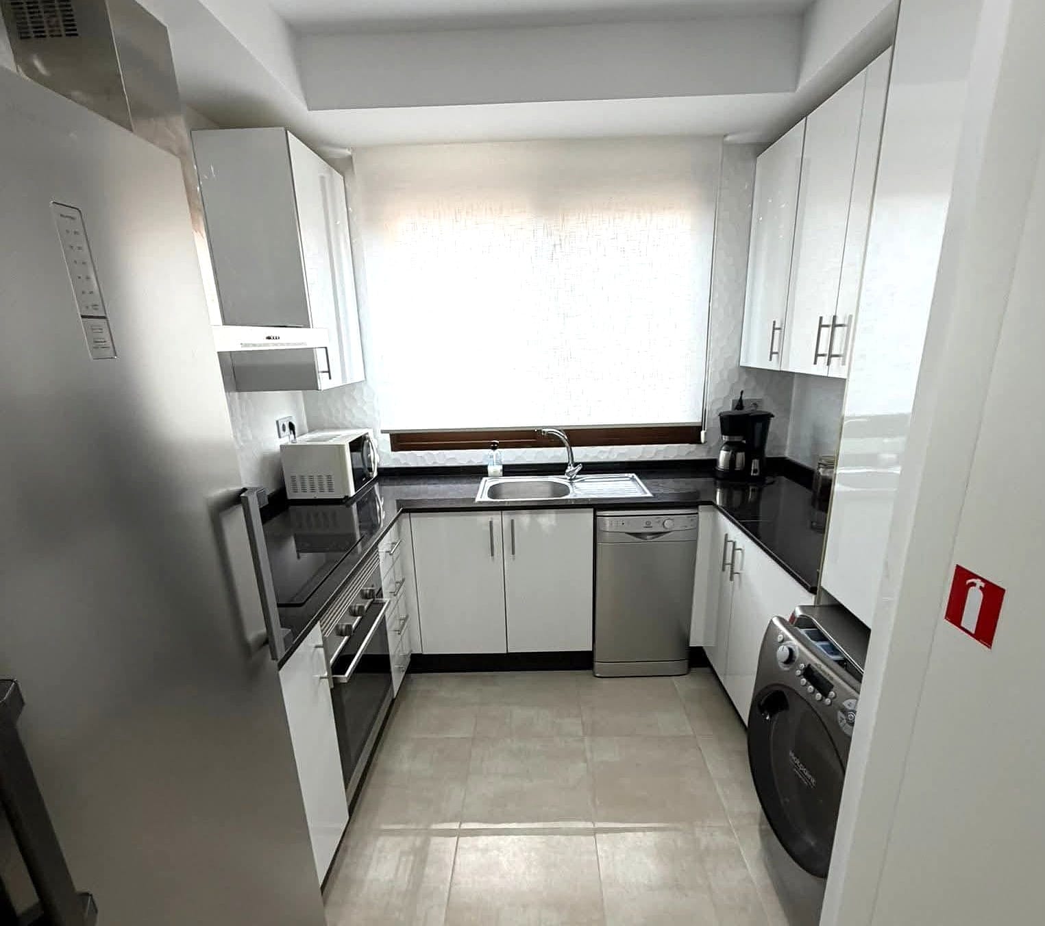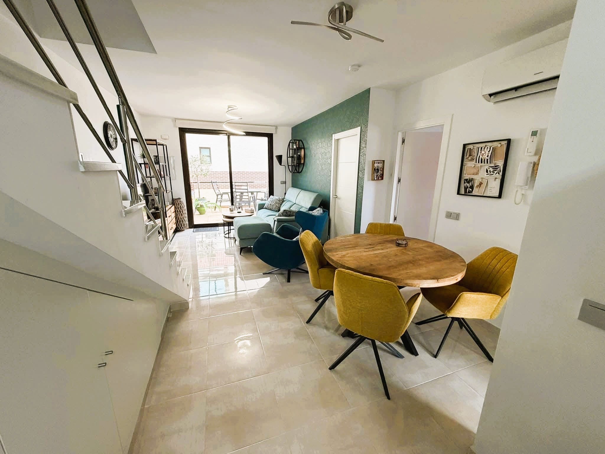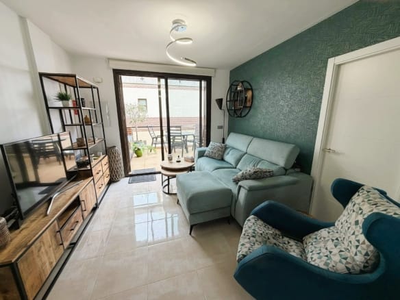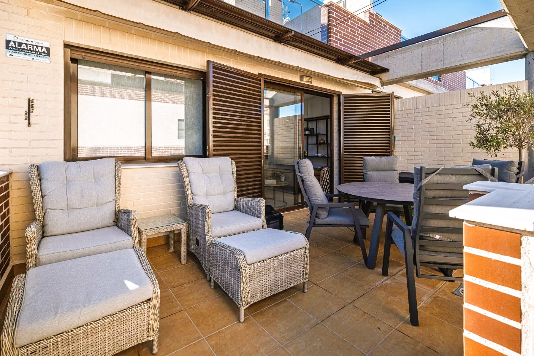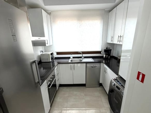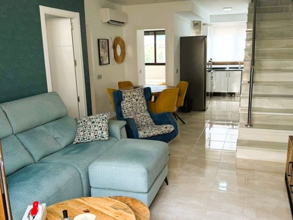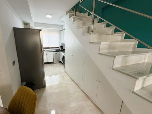 On the main floor, the property features a bright living and dining area with direct access to the terrace, a fully equipped modern kitchen with induction hob, dishwasher, washing machine, microwave and large fridge and freezer, two bedrooms with fitted wardrobes and a bathroom with shower. The upper floor offers a spacious master bedroom with fitted wardrobes, a second bathroom and direct access to the private rooftop solarium, which is perfect for sunbathing, outdoor dining and relaxing.