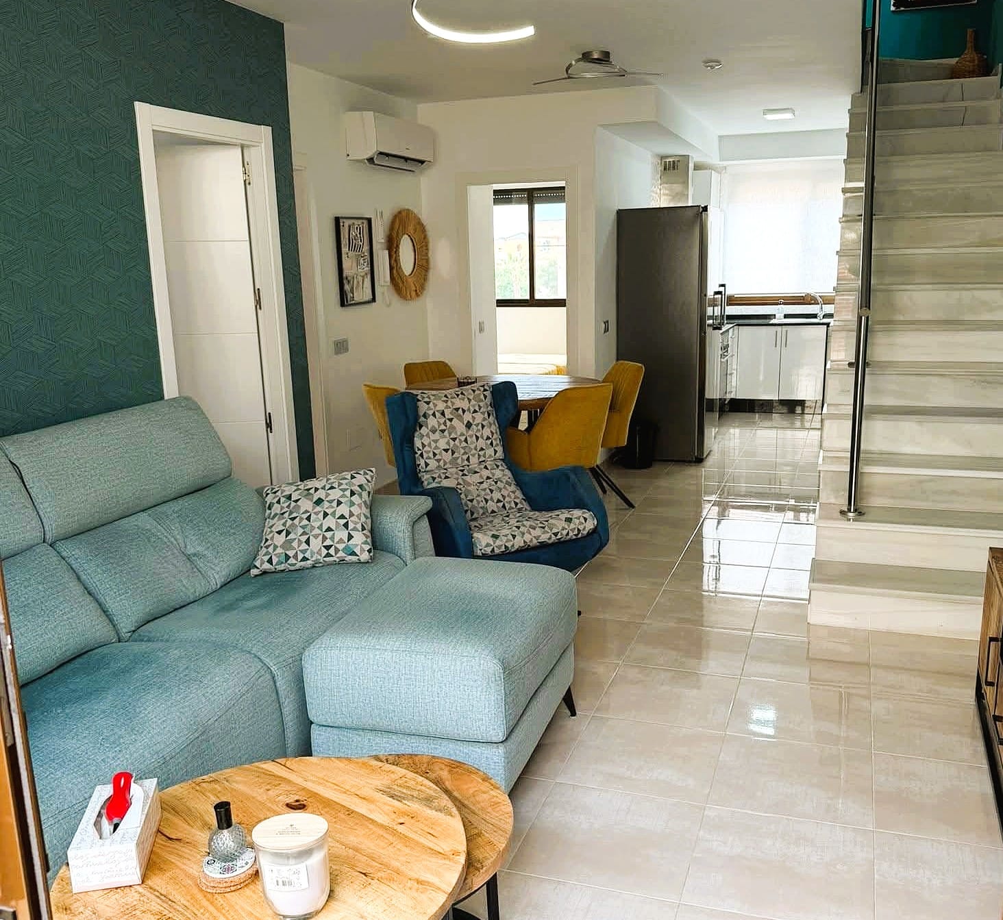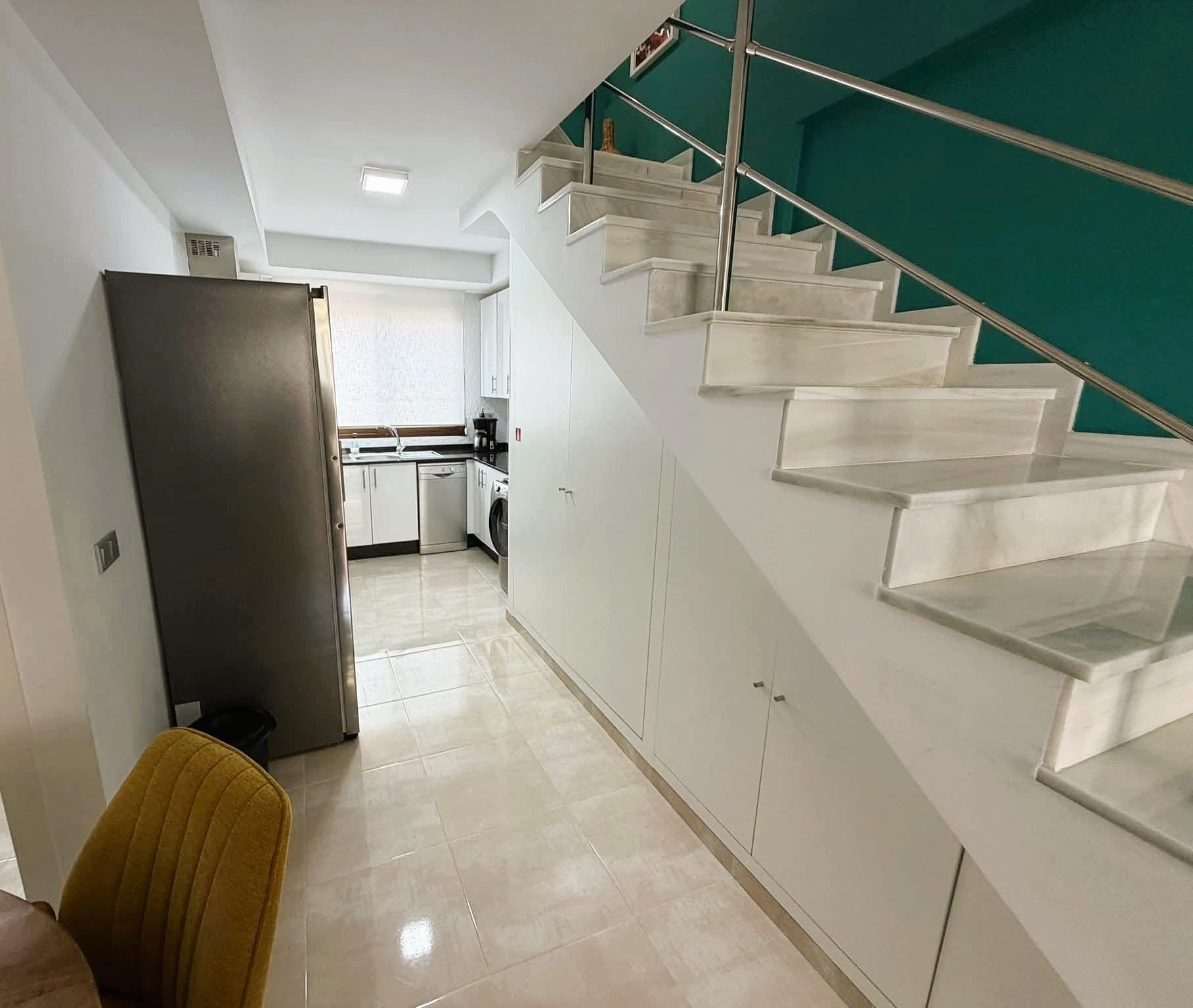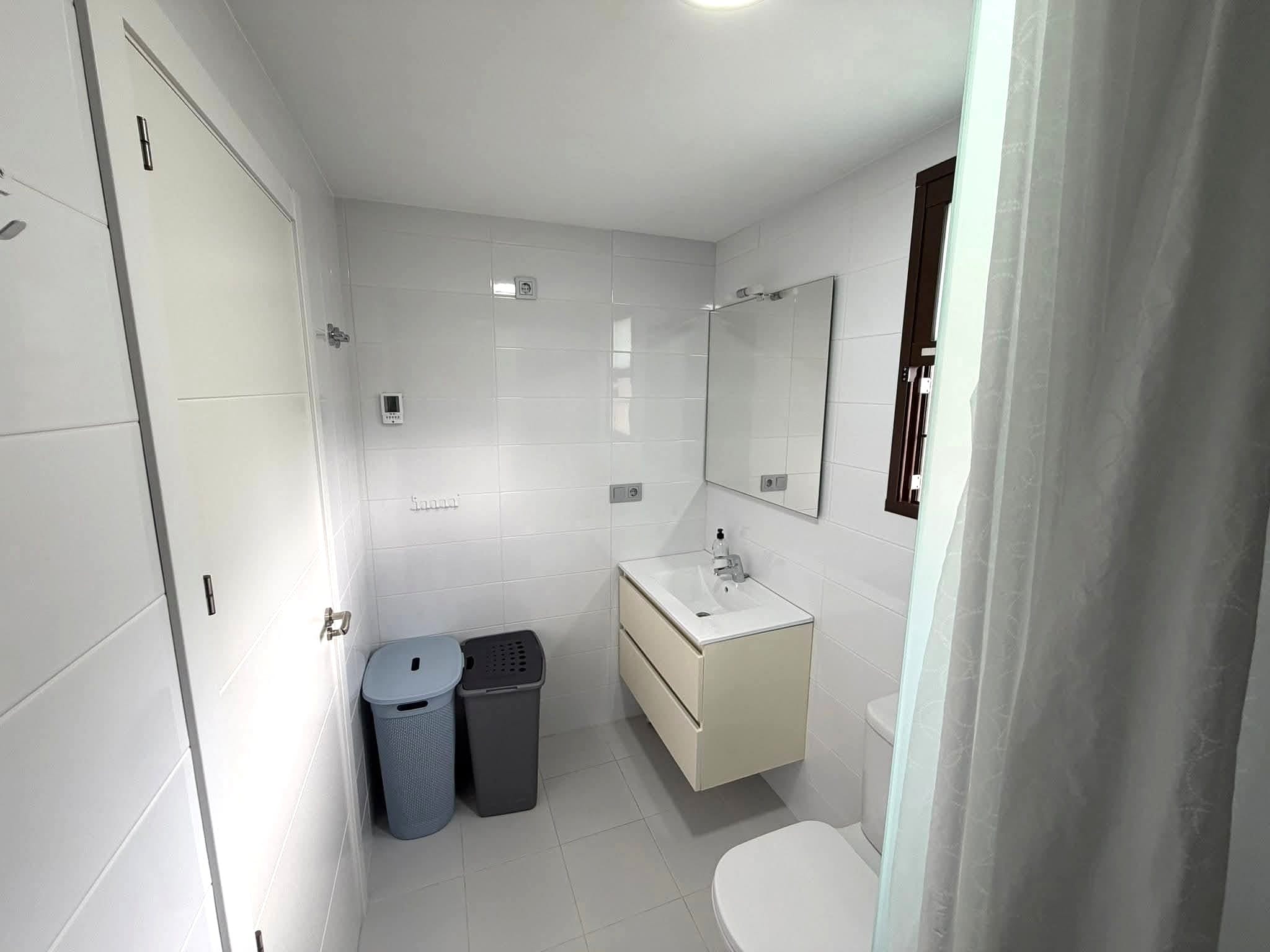On the main floor, the property features a bright living and dining area with direct access to the terrace, a fully equipped modern kitchen with induction hob, dishwasher, washing machine, microwave and large fridge and freezer, two bedrooms with fitted wardrobes and a bathroom with shower. The upper floor offers a spacious master bedroom with fitted wardrobes, a second bathroom and direct access to the private rooftop solarium, which is perfect for sunbathing, outdoor dining and relaxing.