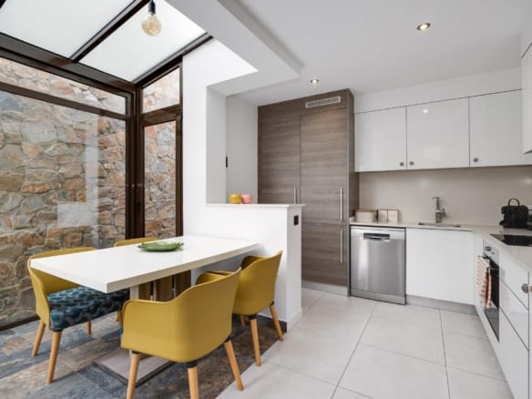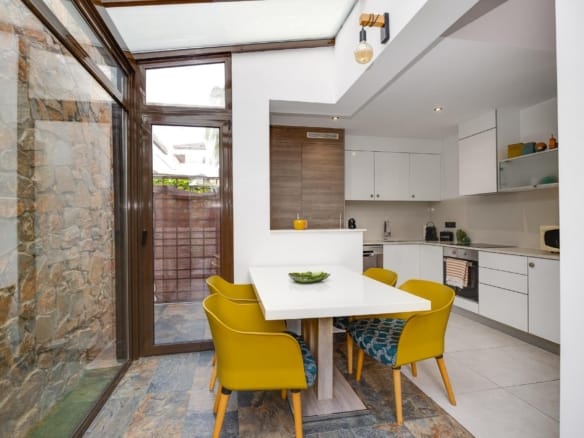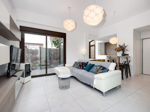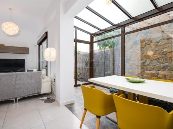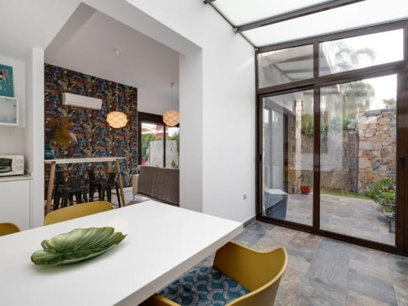 The villa features two spacious bedrooms with built-in wardrobes and two modern bathrooms. The interior offers a bright and welcoming open-plan living and dining area with an open kitchen, creating a perfect space for both everyday living and entertaining. Large windows allow plenty of natural light to fill the home, enhancing the warm and airy atmosphere.