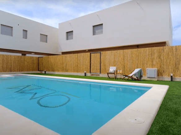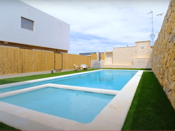 Wake up to soft mountain views and the peaceful embrace of nature in these modern new-build villas in Villamartín, where elegance meets emotion and every day feels like a retreat. Designed for comfort and style, each home offers beautiful exterior spaces with artificial grass by the swimming pool, stylish 60×60 cm porcelain tiled areas, decorative white gravel, and a printed concrete parking space, all complemented by a sleek white monolayer façade. Inside, light-filled interiors welcome you with a fully panelled, floor-to-ceiling kitchen in white, complete with built-in appliances, a quartz worktop breakfast bar with seating, and a 50 cm metallic sink — the perfect setting for slow mornings and intimate evenings. The villas feature aluminium carpentry with double glazing, thermal and acoustic insulation, electric shutters, and an intercom system, ensuring both comfort and security with a high-security panelled entrance door. Elegant bathrooms come fully equipped with suspended vanity units, mirrors, and shower screens, while built-in wardrobes with soft-closing sliding doors add practicality to every bedroom. A staircase with glass and stainless steel handrail leads you to your private solarium, where you can enjoy sun-filled days and starry nights, alongside access to a communal solarium for added relaxation. With pre-installation for ducted air conditioning, an energy-efficient aerothermal system, and solar panels with inverter, these homes are designed for modern Mediterranean living. Finished with smooth matte white walls throughout, this is more than just a property — it’s a place to slow down, breathe, and truly feel at home.